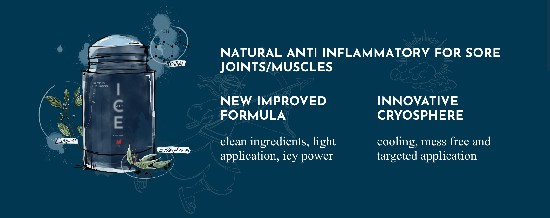 ICE by TAO is a non-chemical, natural sports balm made for sore joints and aching muscles. inspired by thousand year old traditional Chinese medicine, ICE by TAOÂ supports circulation and provides instant tingling, cooling relief.